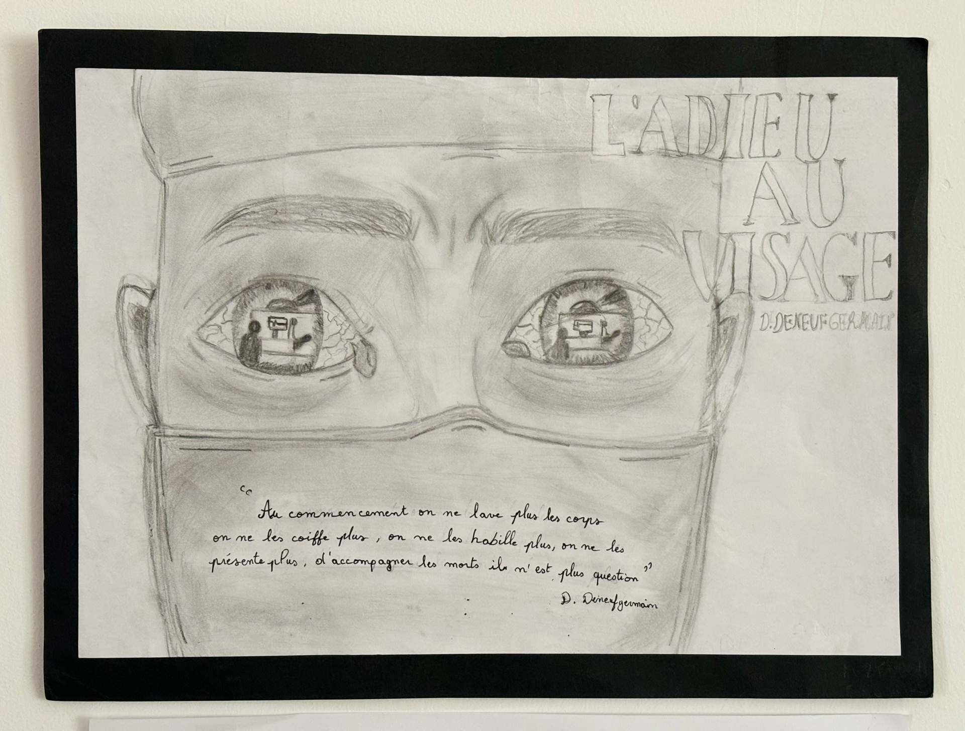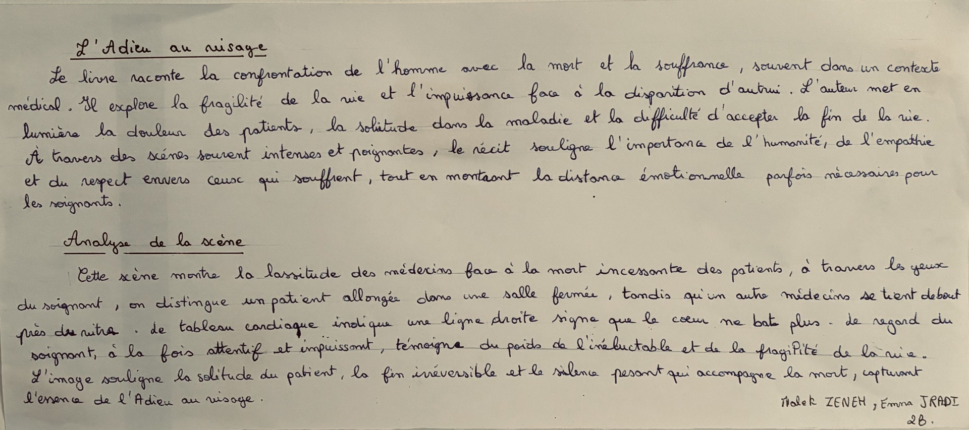 Dans la classe de 2ndeB du lycée Français International M’Hamed Driss de Sousse, deux élèves motivés, Malek Zeneh et Emma Jradi, on fait un résumé du livre « L’Adieu au visage », écrit par David Deneufgermain, puis une analyse de cet ouvrage. Ils ont également proposé un beau dessin qui peut représenter le livre, avec une citation de l’auteur, présente sur le masque de la personne dessinée.