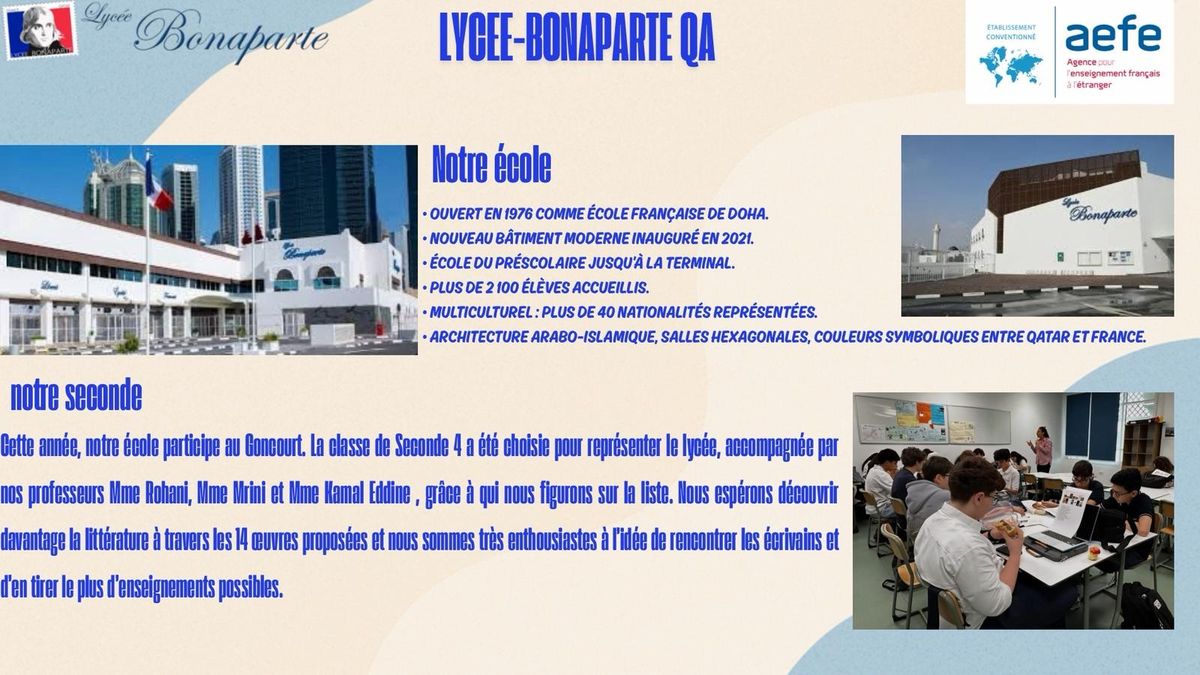Bienvenue au Qatar ! Et plus précisément Doha ! Les élèves sont heureux de vous présenter leur établissement multiculturel et dynamique avec plus de quarante nationalités représentées et de nombreux événements et activités, que vient encore enrichir cette participation au Goncourt des Lycéens !